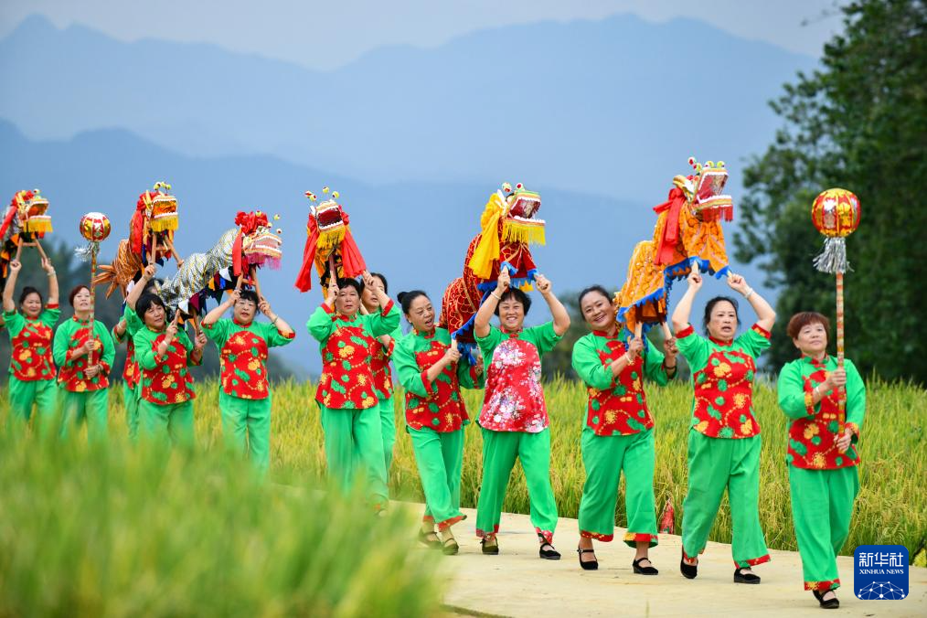 9月20日,在旱地优质稻种植示范区,当地群众抬着板凳龙在田间穿行。