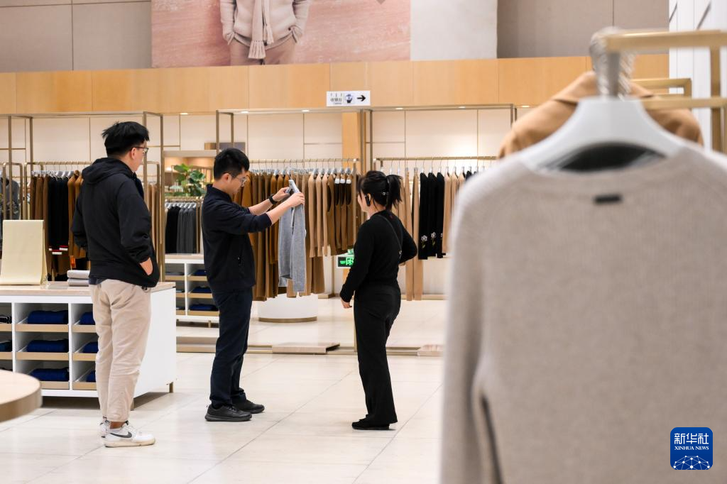 9月20日,顾客(中)在内蒙古鄂尔多斯羊绒集团有限责任公司的工厂店挑选羊绒服饰。