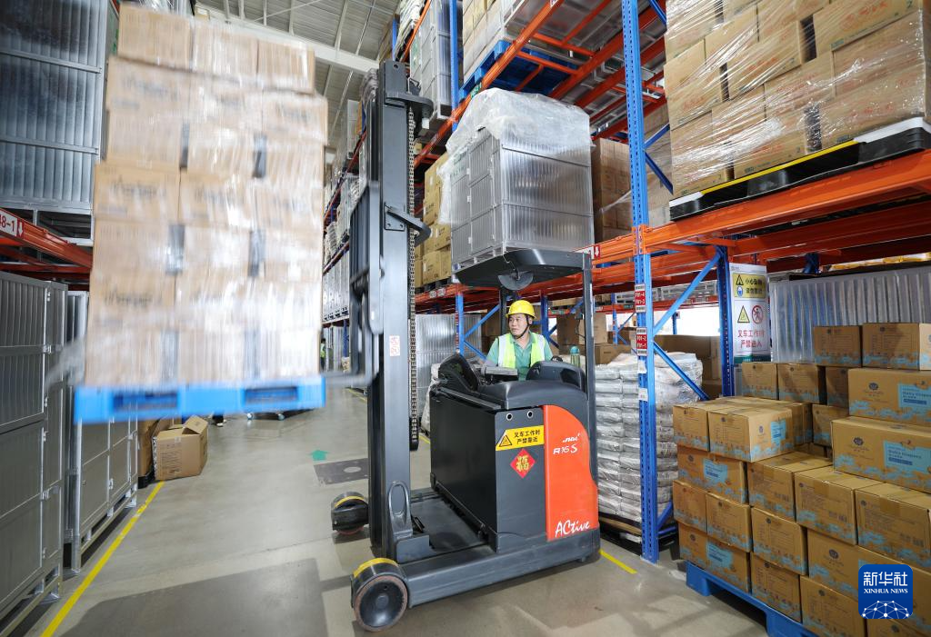 9月21日,在山东省滕州市爱拉森医用品有限公司仓储内,一名工人驾驶叉车装卸货物。