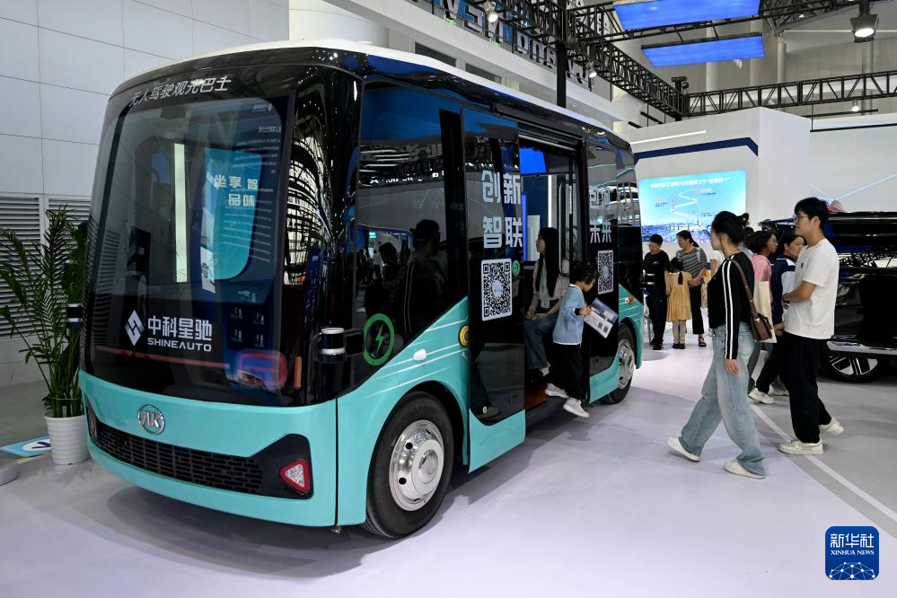 9月21日,在2024世界制造业大会上,人们参观体验一款无人驾驶观光巴士。
