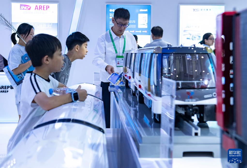 9月21日,小朋友在2024世界制造业大会上参观一款自动旅客捷运系统模型。