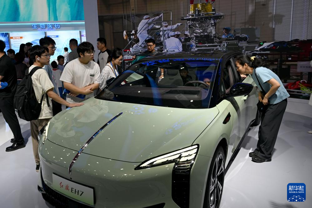 9月21日,在2024世界制造业大会上,人们参观体验红旗EH7新能源汽车。