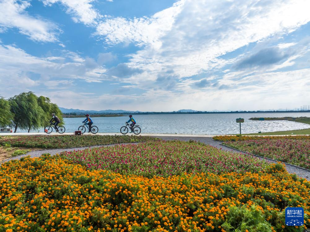 9月21日,骑行爱好者在滕州市马河水库景区骑行。