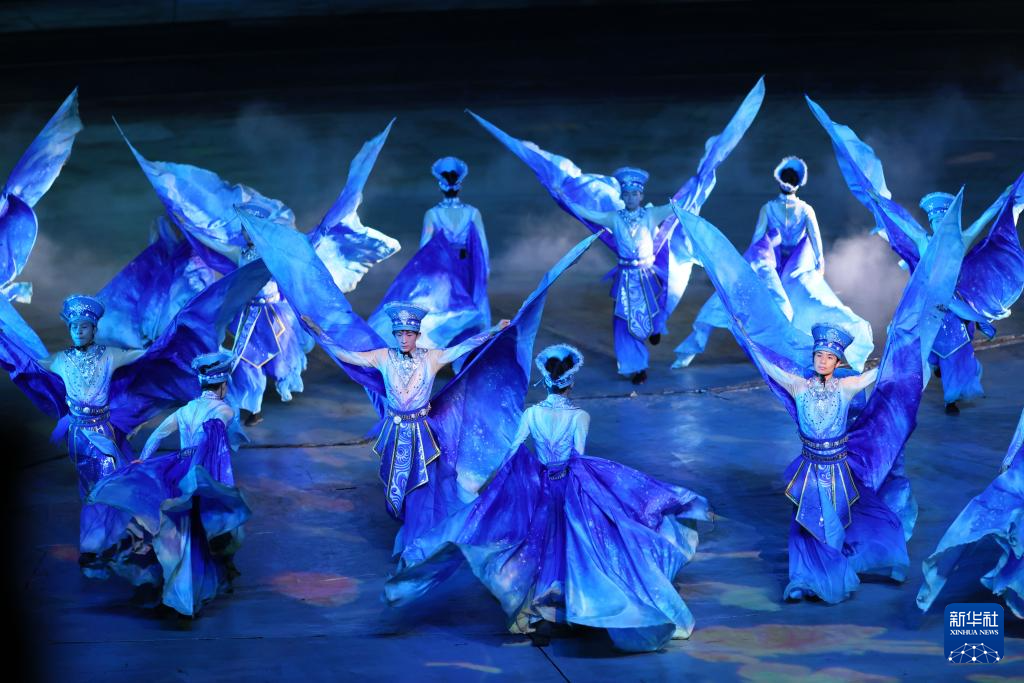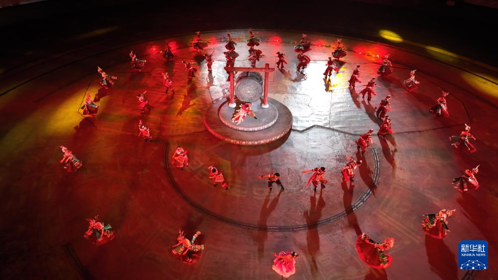 9月20日晚,演员在贵州省雷山县大塘镇表演苗族歌舞诗剧《仰欧桑》(无人机照片)。