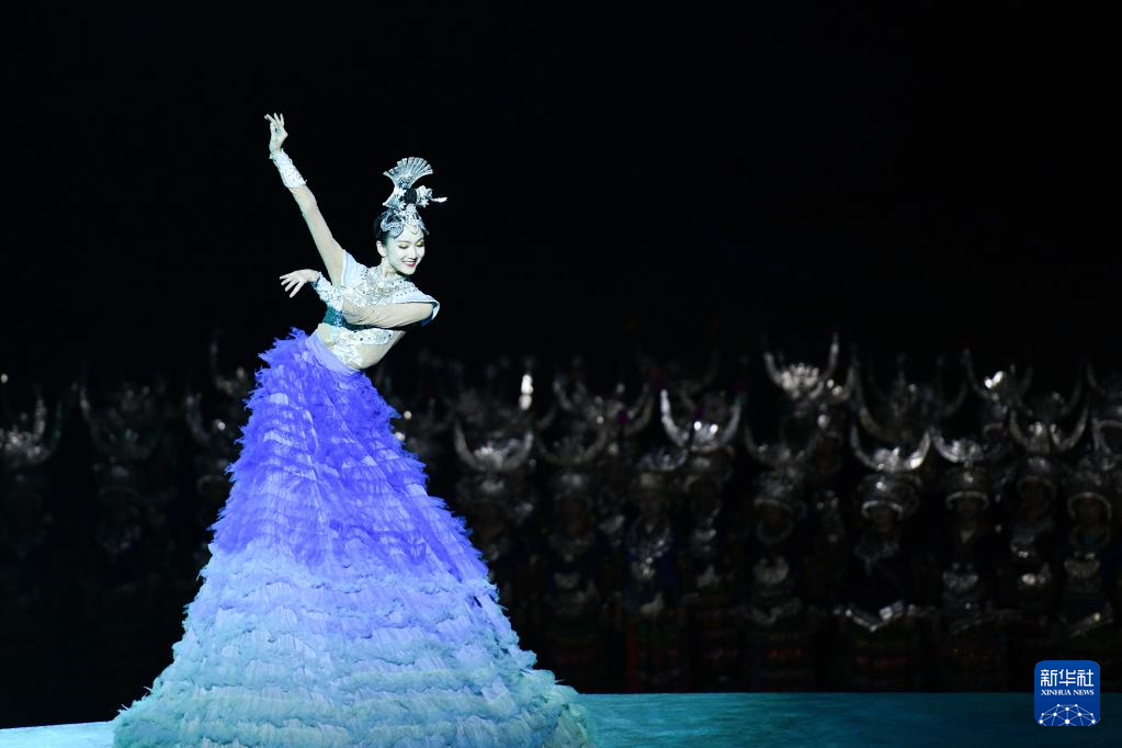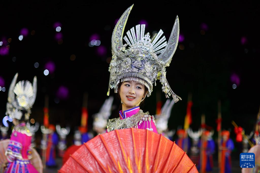 9月20日晚,演员在贵州省雷山县大塘镇表演苗族歌舞诗剧《仰欧桑》。