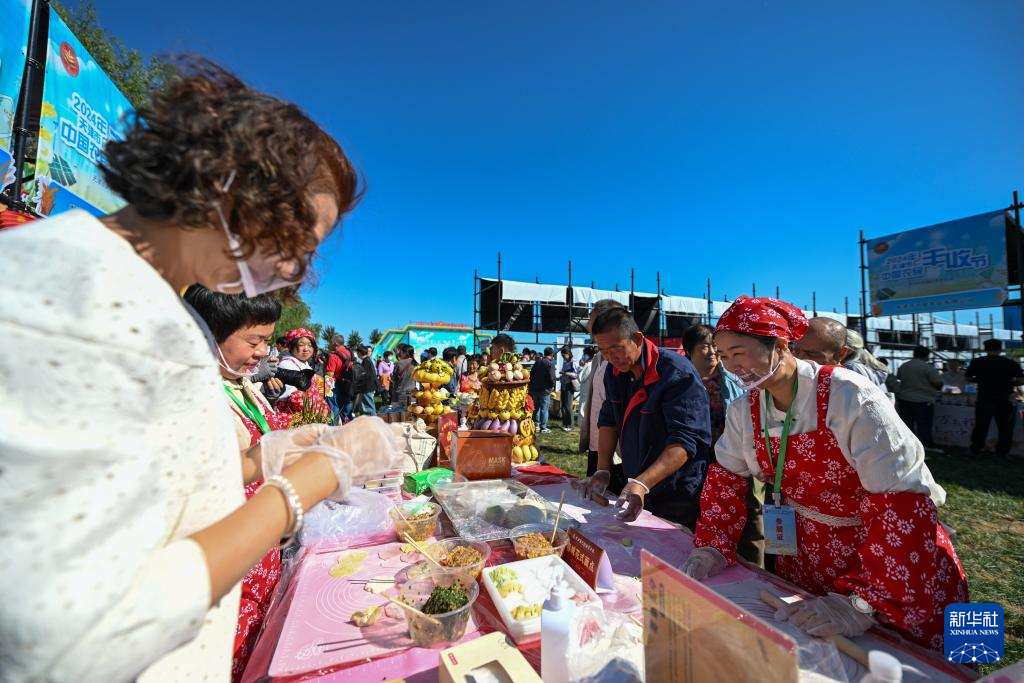 9月22日,在天津市武清区南蔡村镇天民田园举行的2024年天津市中国农民丰收节主会场活动上,工作人员在制作面食。