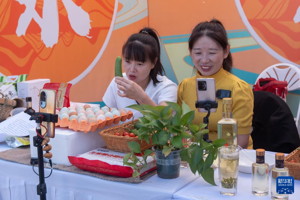 9月22日,在湖北省孝感市应城市城北街道红堂村举行的2024年中国农民丰收节湖北主场活动上,主播在现场直播带货。