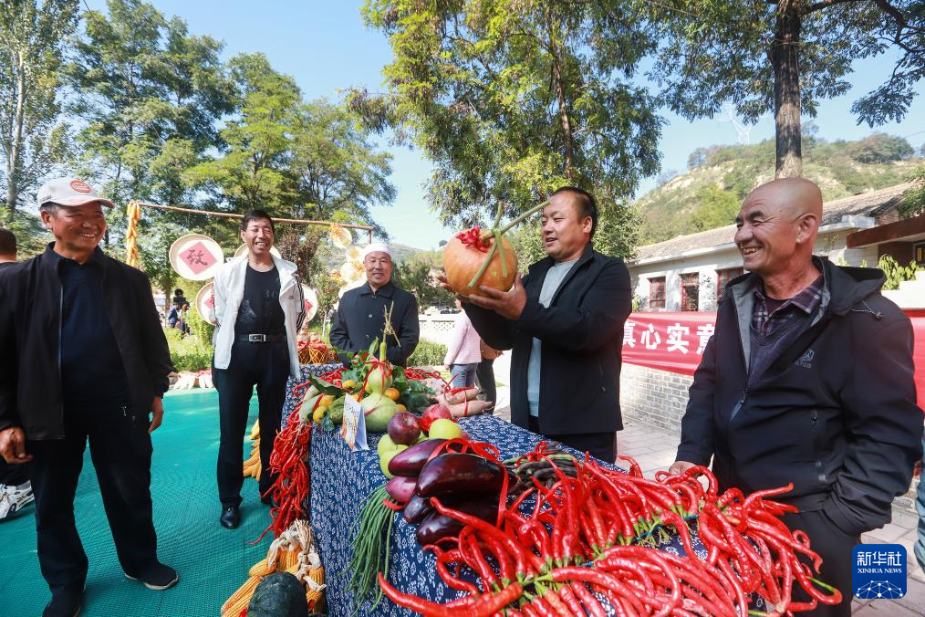 9月22日,村民在甘肃省平凉市崆峒区上杨回族乡农民丰收节活动中展示农副特产。
