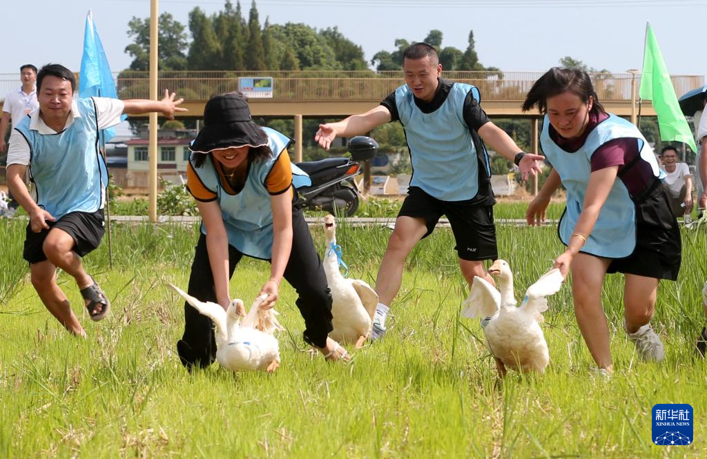 9月22日,四川省眉山市青神县农民在参加当地庆祝丰收节举办的乡村赶大鹅比赛。