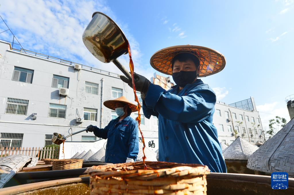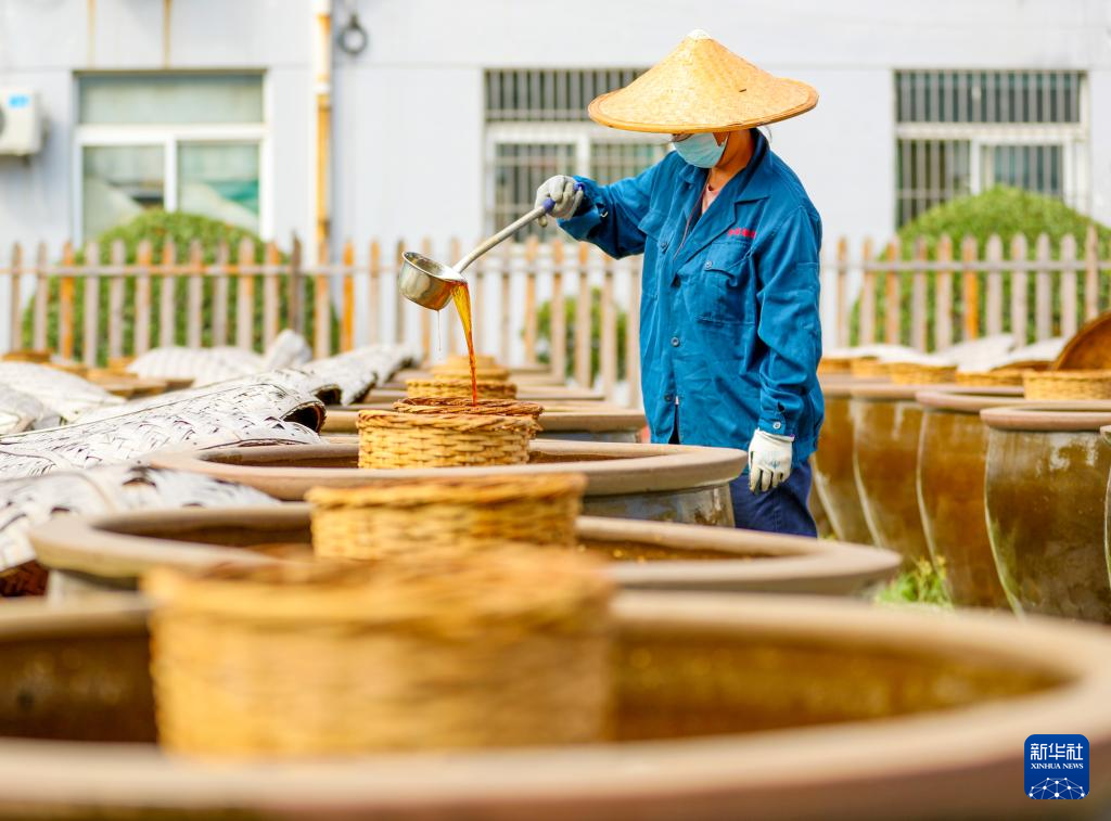9月21日,滕州市鼎盛酿造有限公司的工人在晾晒场上浇淋晒制酱油。