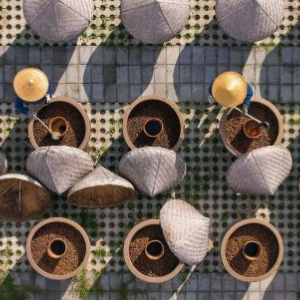 9月21日,滕州市善南街道山东福藤食品有限公司的工人正在进行浇淋酱油作业(无人机照片)。