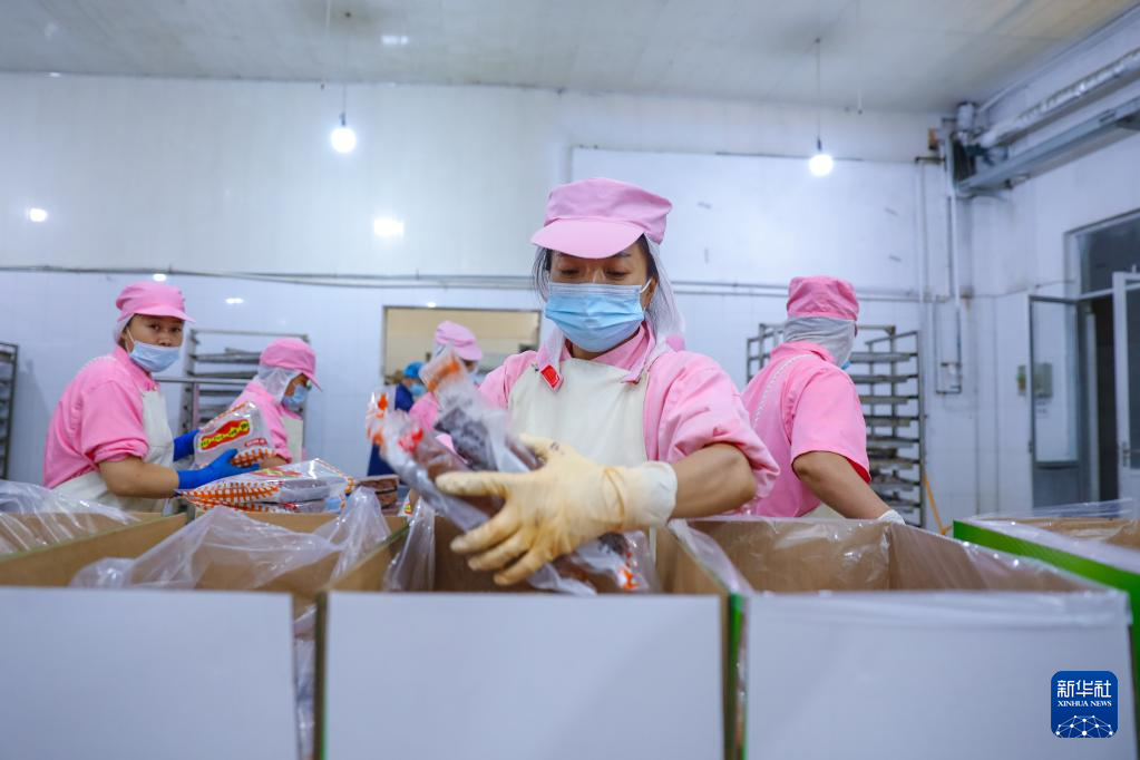 9月21日,滕州市善南街道山东福藤食品有限公司的工人在车间对食品进行装箱。