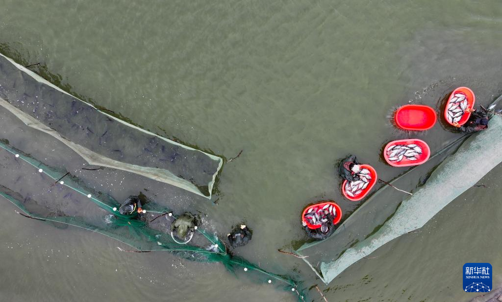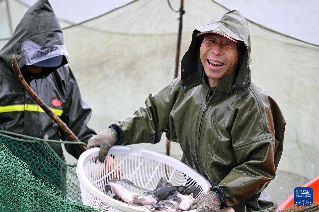 9月20日,工作人员在位于宁夏银川市贺兰县立岗镇兰丰村的晶诚水产养殖基地内收获淡水鲈鱼。