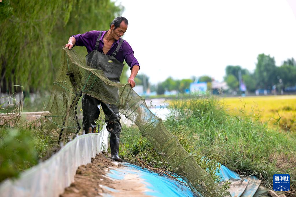 9月20日,工作人员在位于宁夏银川市贺兰县立岗镇永兴村的花田香蟹稻田主题公园内收获稻田蟹。