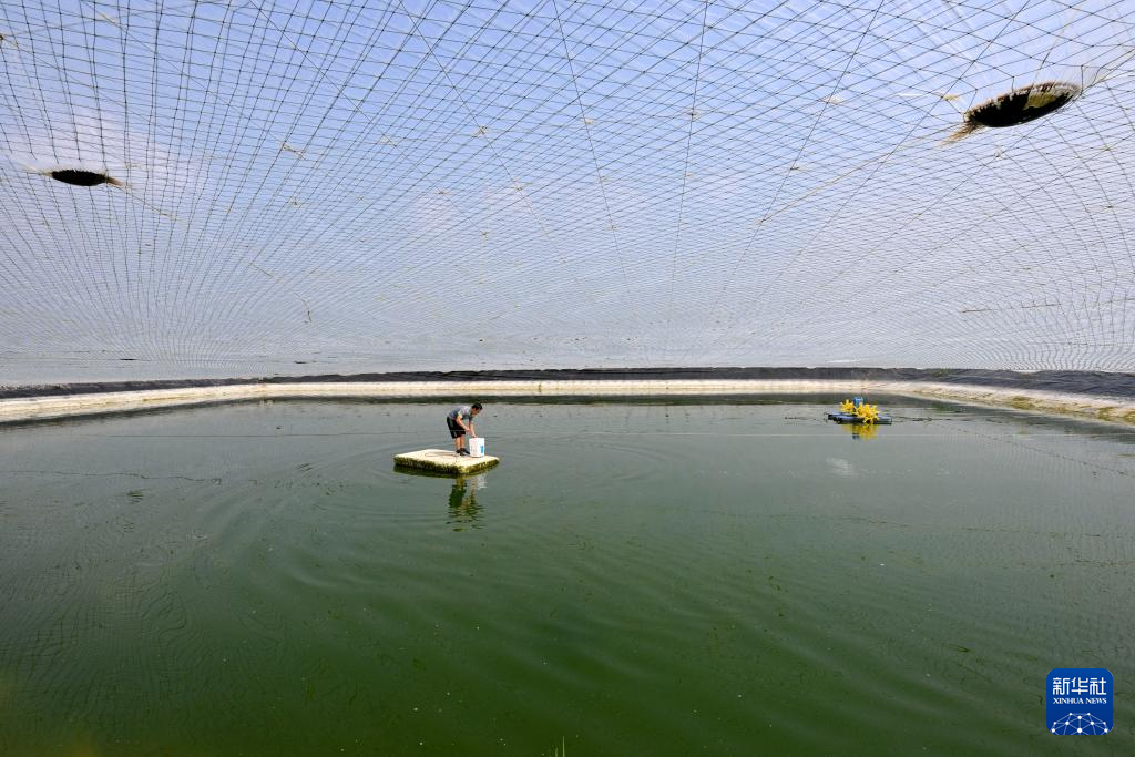 9月19日,宁夏贺兰县蓝湾生态园南美对虾养殖基地,工作人员在喂食对虾。