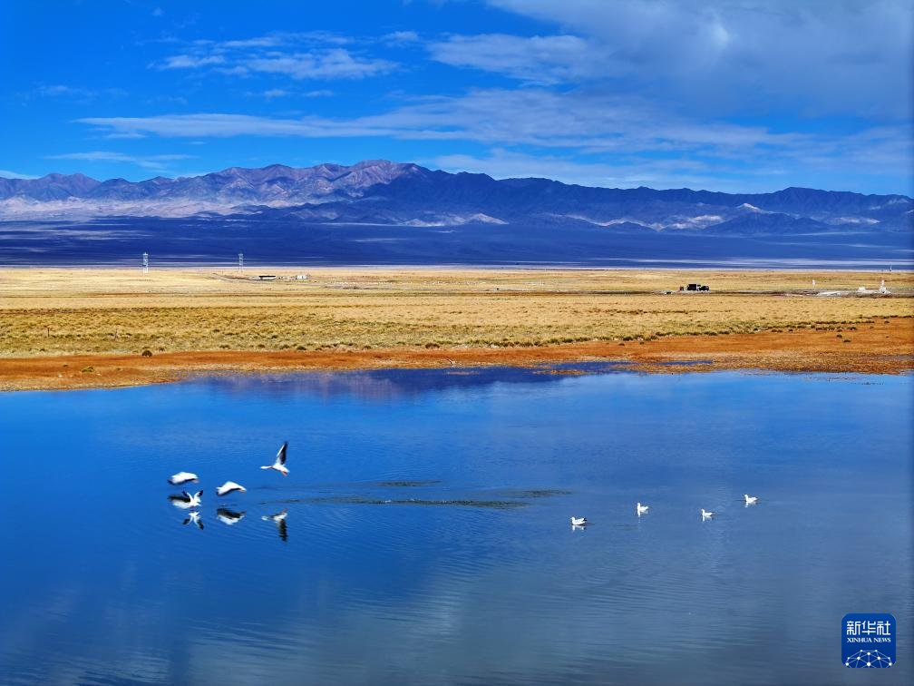 9月21日在甘肃省阿克塞哈萨克族自治县阿伊纳乡拍摄的小苏干湖(无人机照片)。