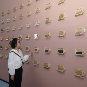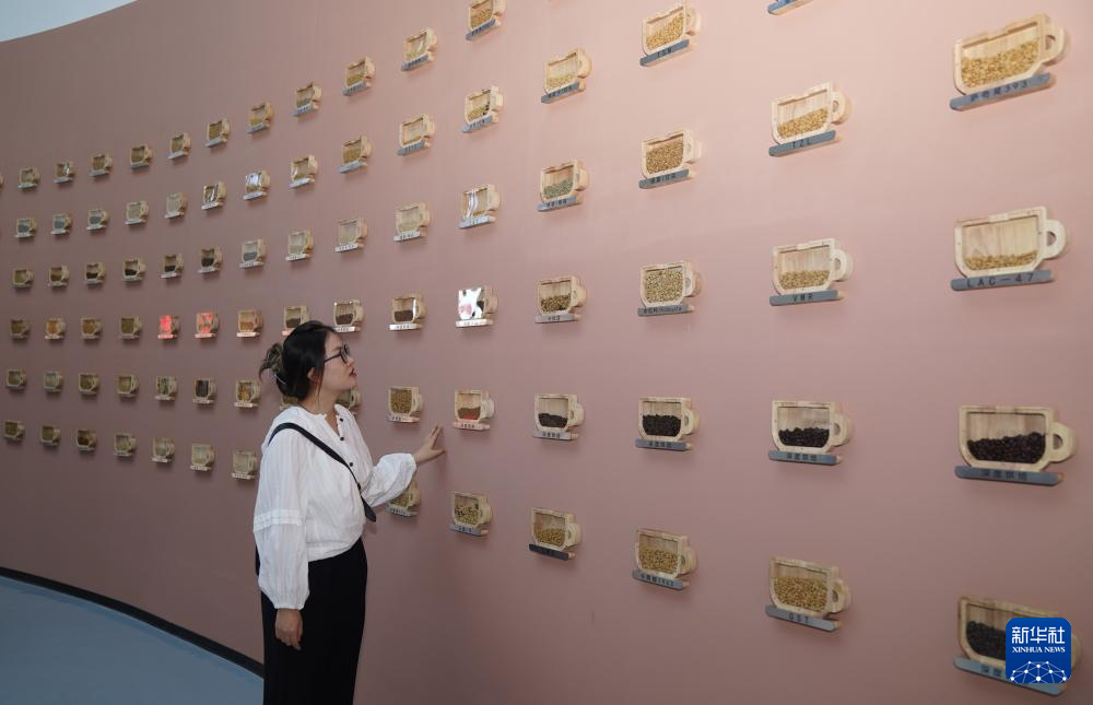9月23日,游客在保山市咖啡博物馆观看“咖啡种子墙”。