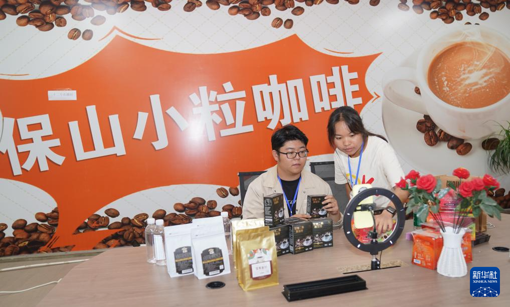 9月23日,商家在保山市隆阳区咖啡直播基地直播销售咖啡产品。