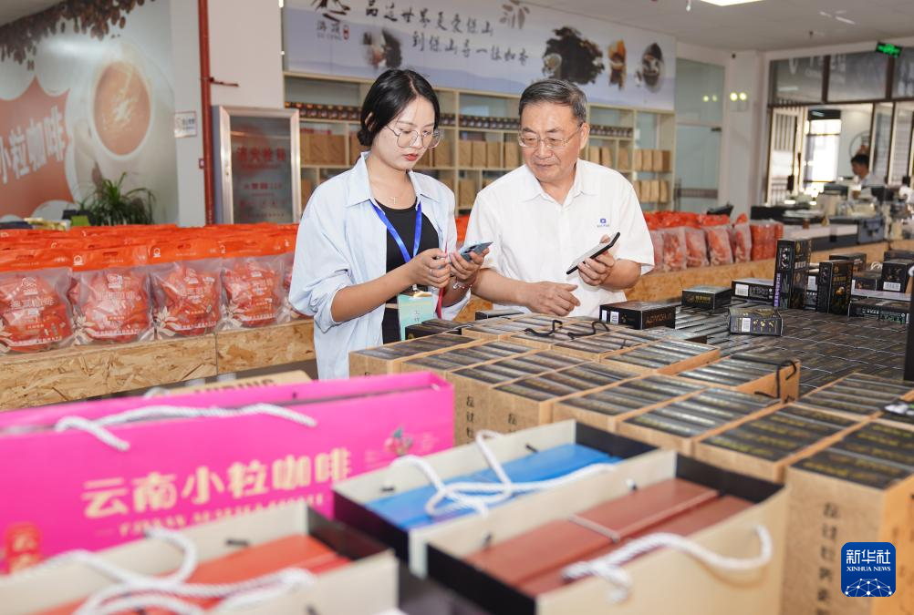 9月23日,游客在保山市隆阳区咖啡直播基地购买咖啡。