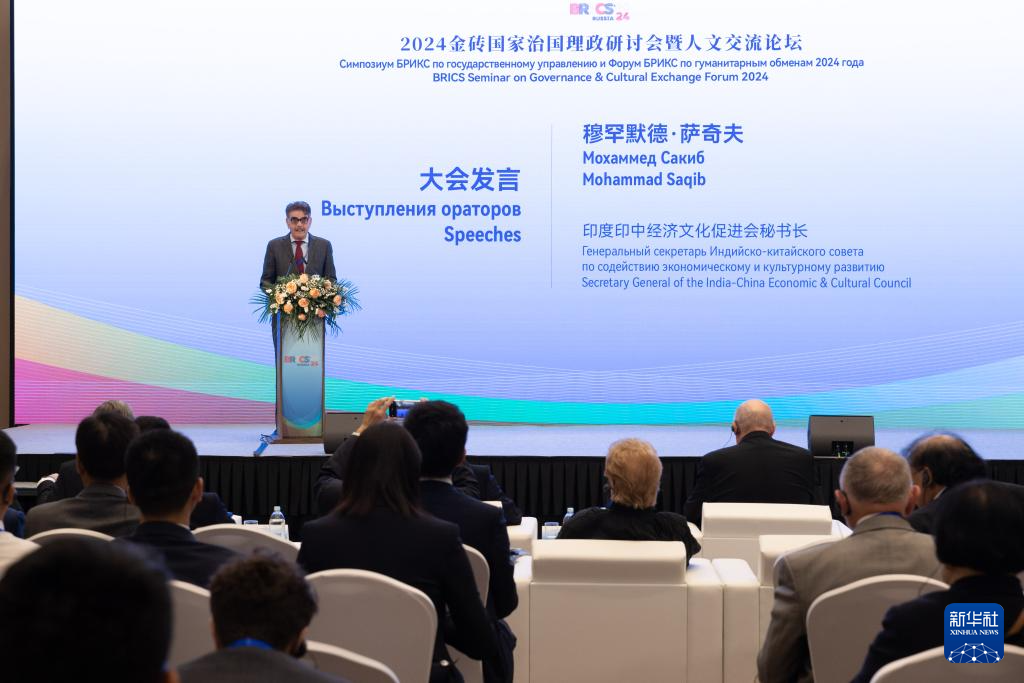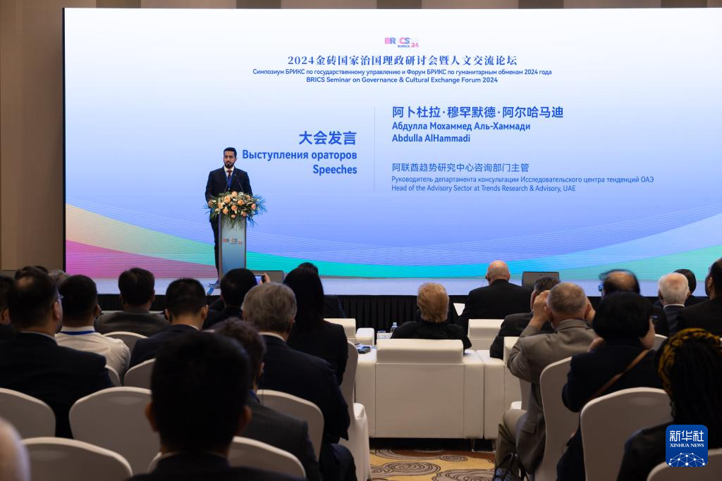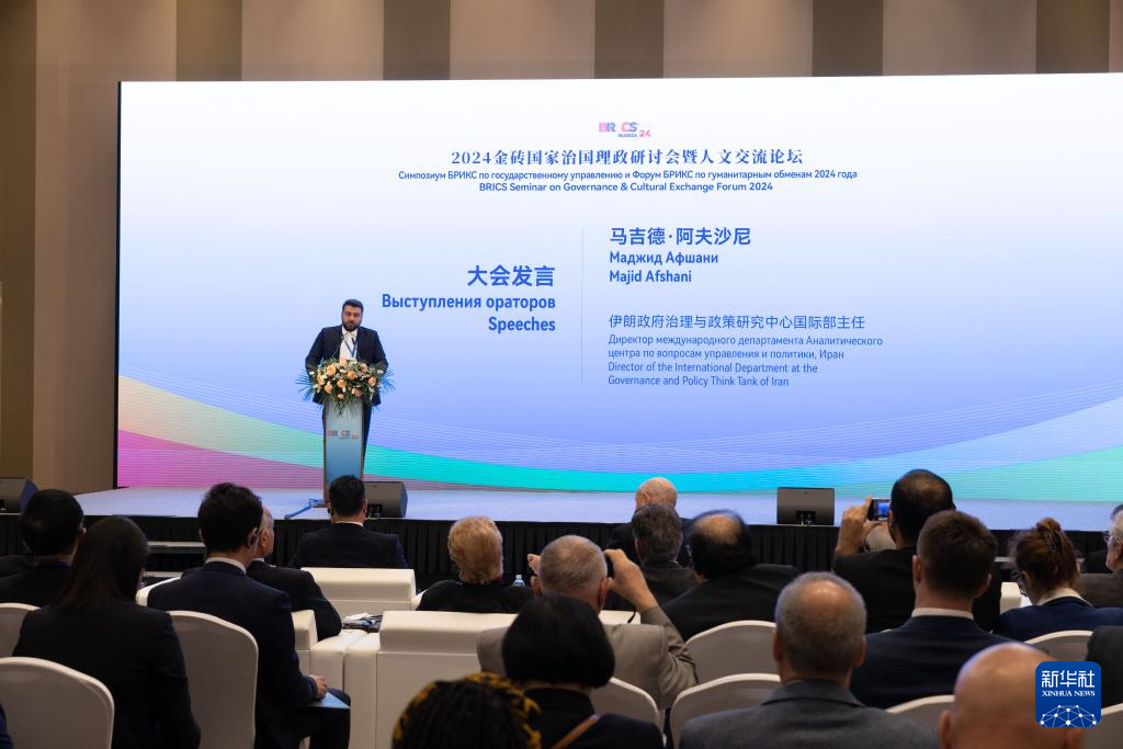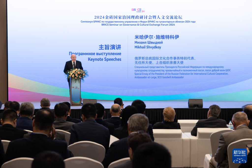 当地时间23日,2024金砖国家治国理政研讨会暨人文交流论坛在俄罗斯首都莫斯科举行。来自中国、俄罗斯、印度、巴西、南非、埃及、伊朗、阿联酋等金砖国家和金砖国家新开发银行等的120余名代表围绕“金砖国家的现代化之路”主题展开研讨交流。