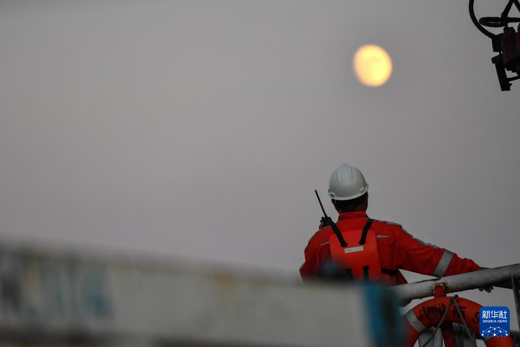 9月16日傍晚,在渤海油田曹妃甸6-4油田中心平台值班船上,郑建国看着从海上升起的明月。新华社发(杜鹏辉摄)pagebreak