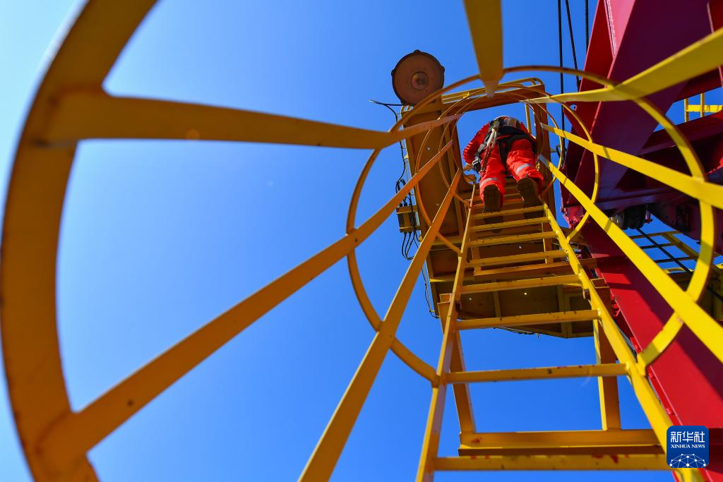 9月17日,郑建国在渤海油田曹妃甸6-4油田海上平台上攀登直梯。新华社发(杜鹏辉摄)pagebreak