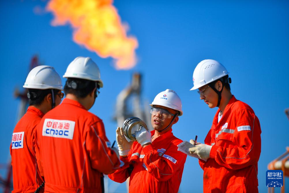 9月17日,在渤海油田曹妃甸6-4油田中心平台,郑建国(右二)与同事分享设备检修经验。新华社发(杜鹏辉摄)pagebreak