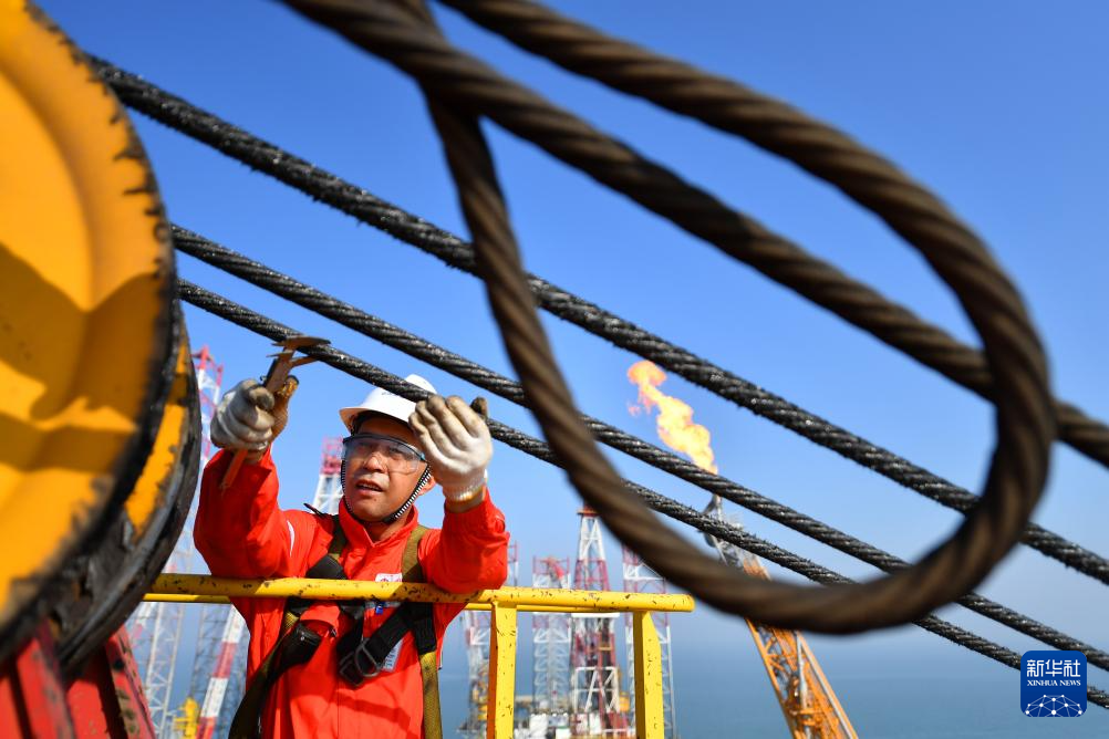 9月17日,在渤海油田曹妃甸6-4油田海上平台,郑建国检查吊车钢丝绳。新华社发(杜鹏辉摄)pagebreak