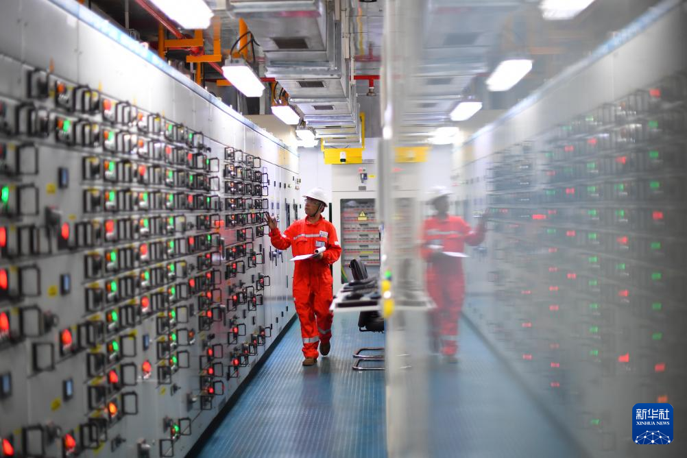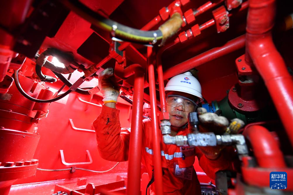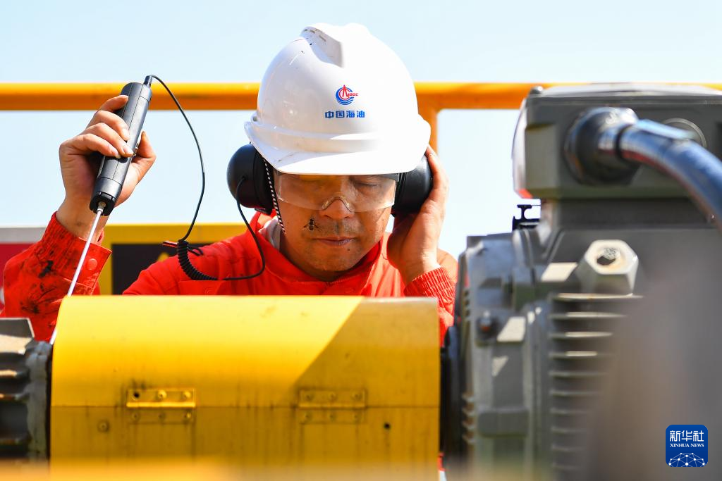 9月17日,在渤海油田曹妃甸6-4油田海上平台,郑建国调试设备。新华社发(杜鹏辉摄)pagebreak