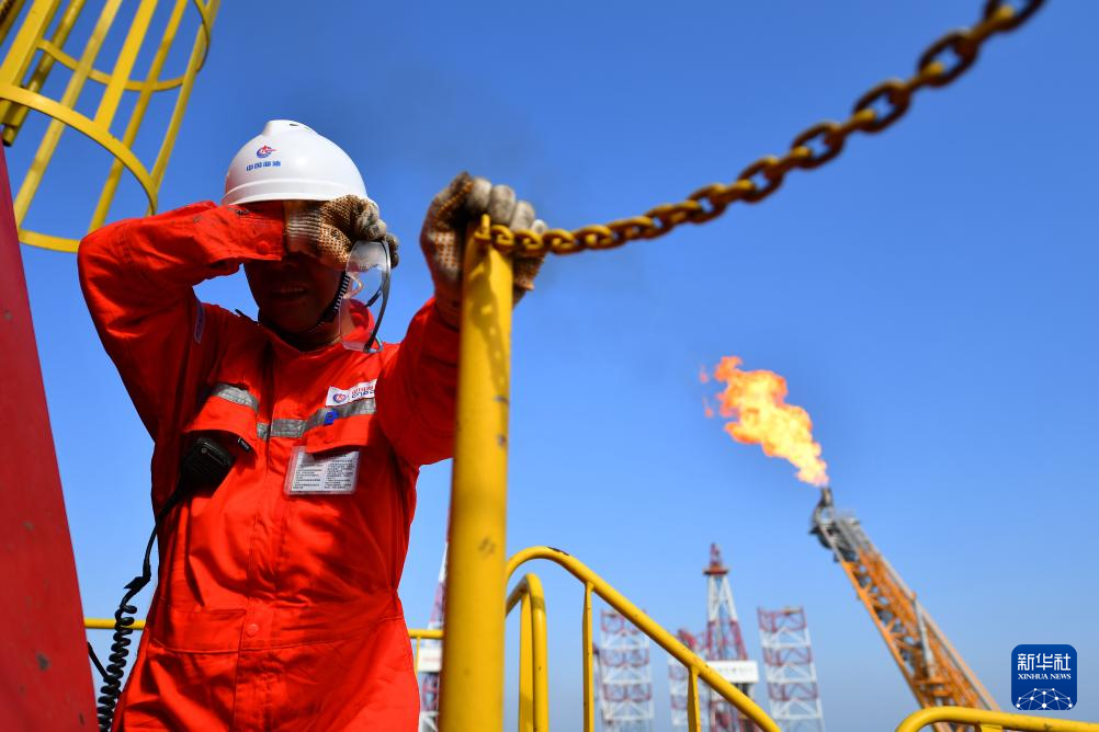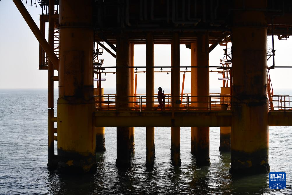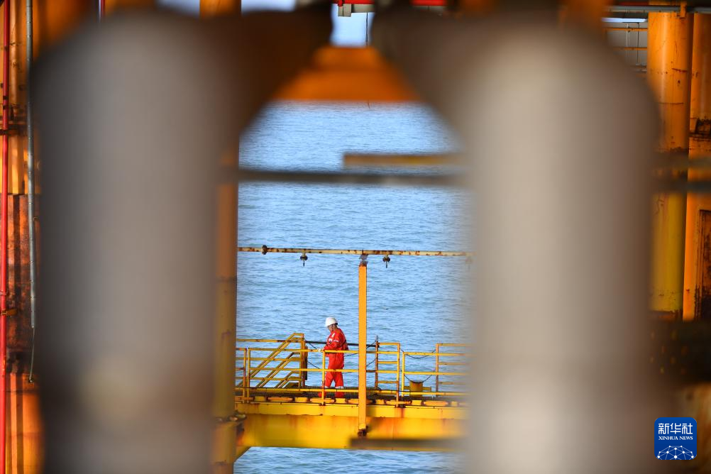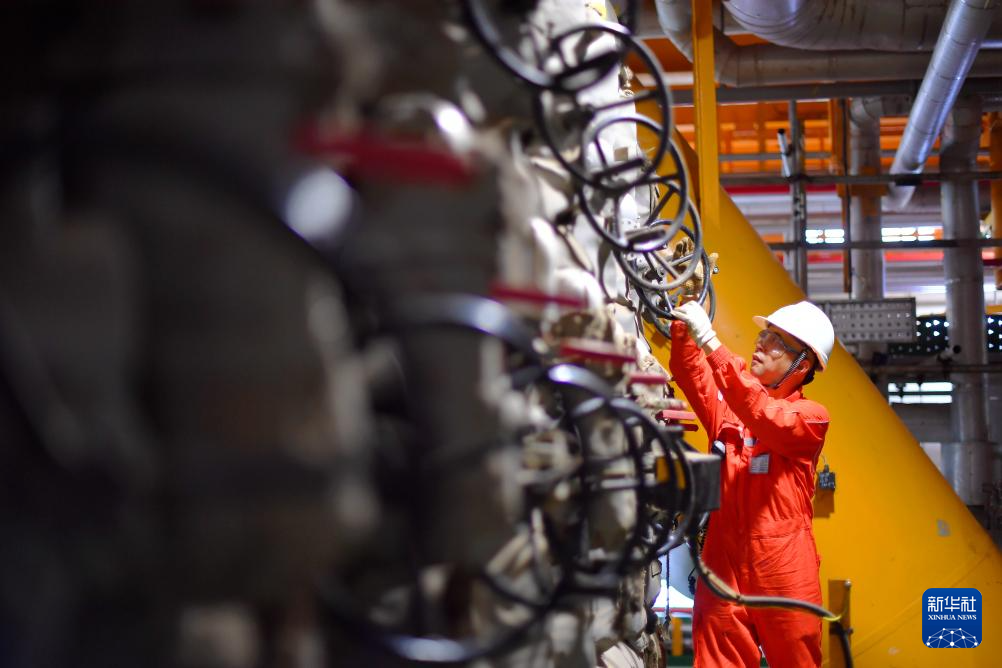 9月17日,在渤海油田曹妃甸6-4油田海上平台,郑建国检查设备流程。新华社发(杜鹏辉摄)