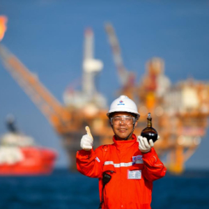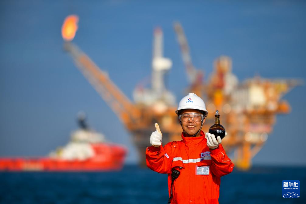 9月17日,在渤海油田曹妃甸6-4油田中心平台,郑建国展示石油样品。