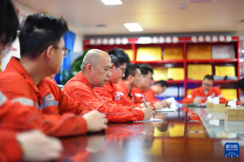 9月18日,在渤海油田曹妃甸6-4油田中心平台,郑建国在早会上记录当天重点工作。新华社发(杜鹏辉摄)pagebreak