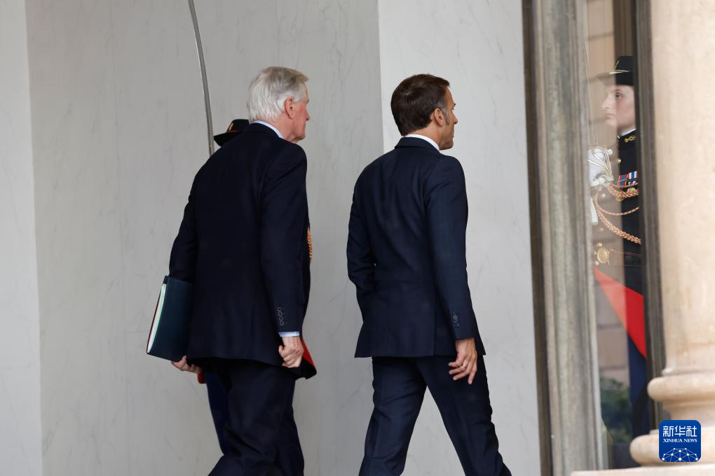 9月23日,法国总理巴尼耶(左)和法国总统马克龙步入总统府爱丽舍宫出席新内阁首次会议。