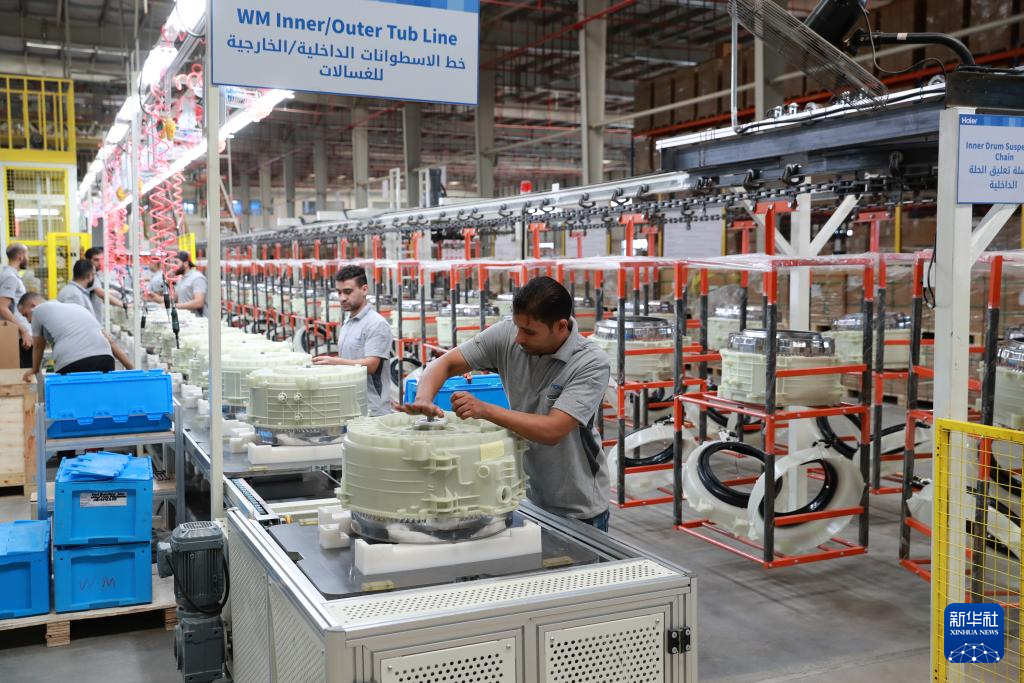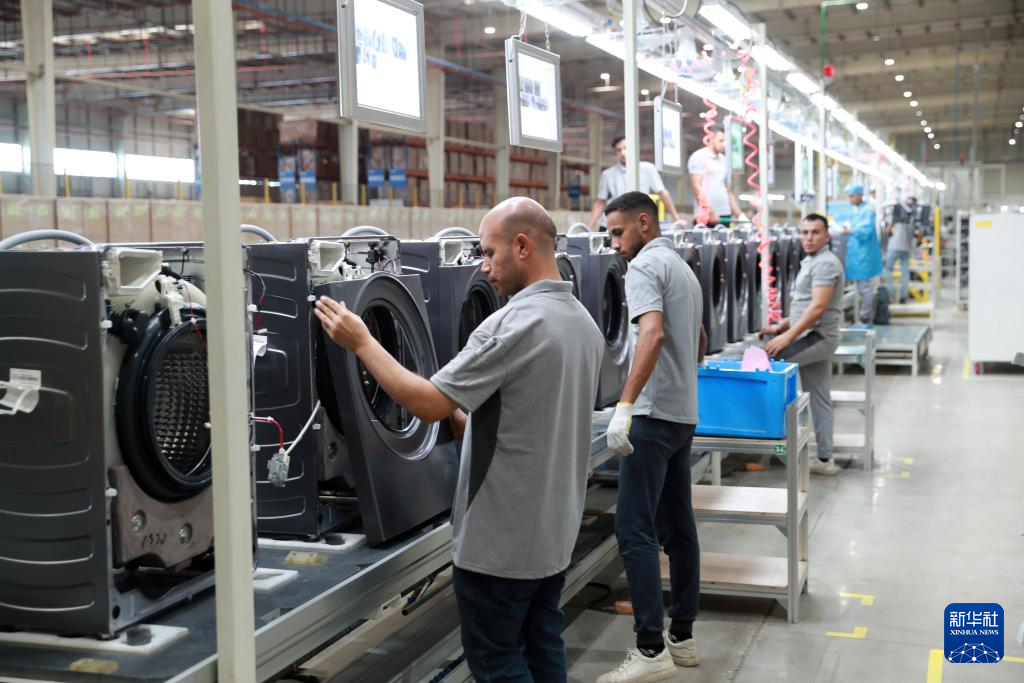 9月23日,在埃及斋月十日城,工人在海尔埃及生态园一期项目的洗衣机生产线上工作。