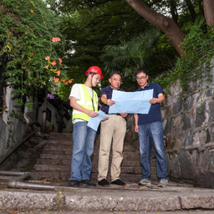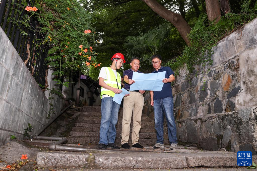 9月24日,潘守卫(中)与上城区紫阳街道十五奎巷社区工作人员(右)、施工方代表一同商讨御街二十三坊巷韵味提升项目施工细节。
