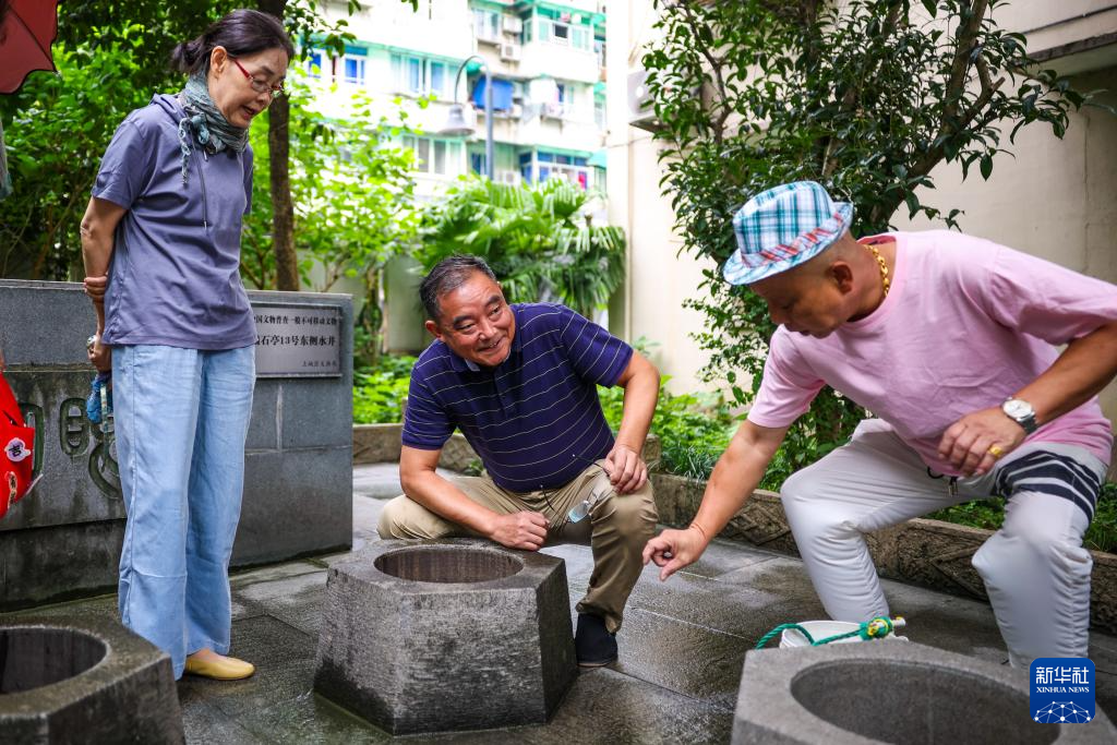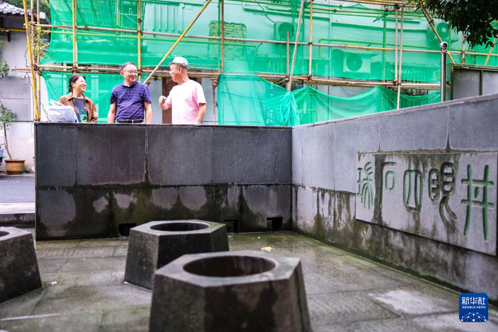 9月24日,潘守卫(中)在上城区紫阳街道太庙社区瑞石四眼井旁与社区居民讲述古井的历史。