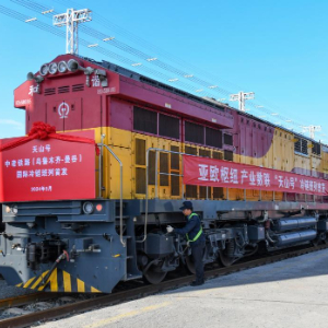 9月24日,在乌鲁木齐国际陆港区,满载鲜食葡萄的班列缓缓驶出。