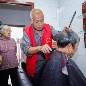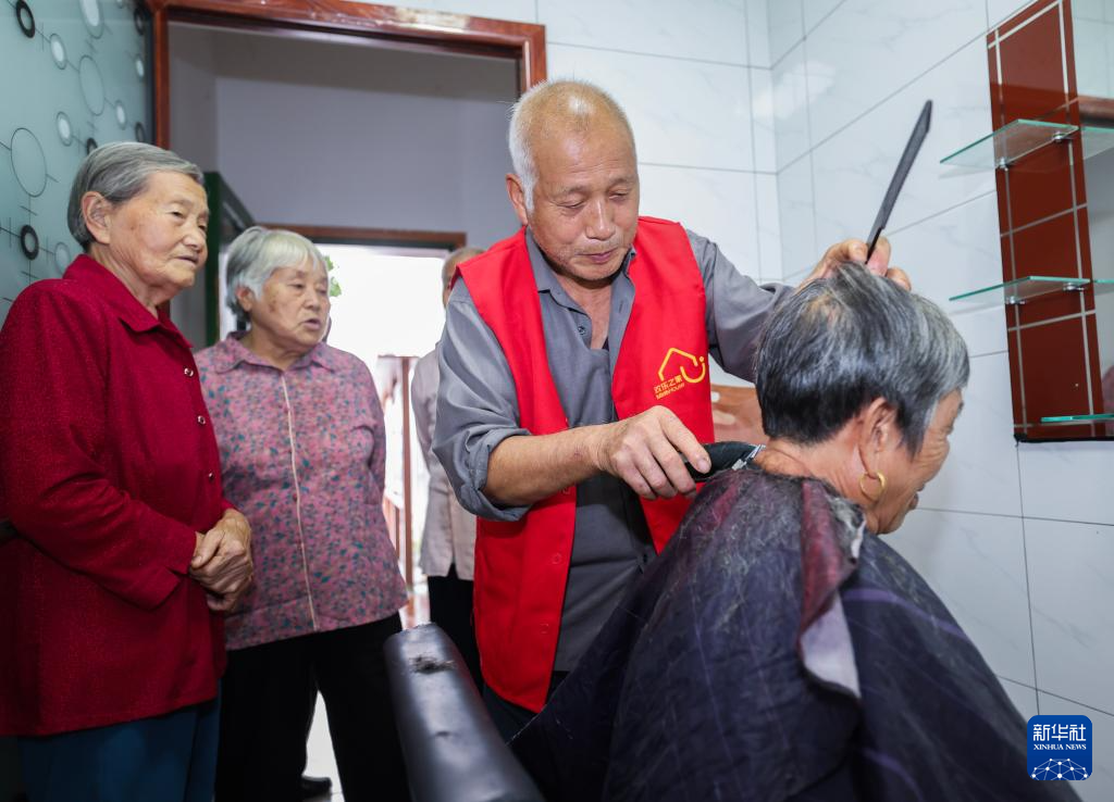 9月24日,在东白湖镇乐龄中心活动现场,志愿者给老人义务理发。
