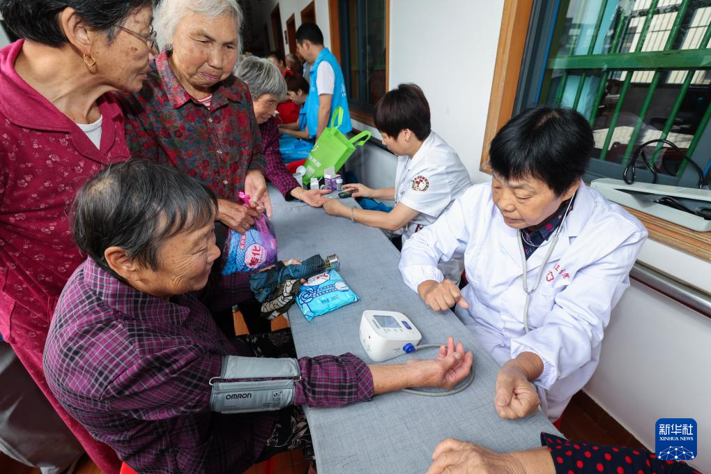 9月24日,在东白湖镇乐龄中心活动现场,医务人员给老人义诊测血压。