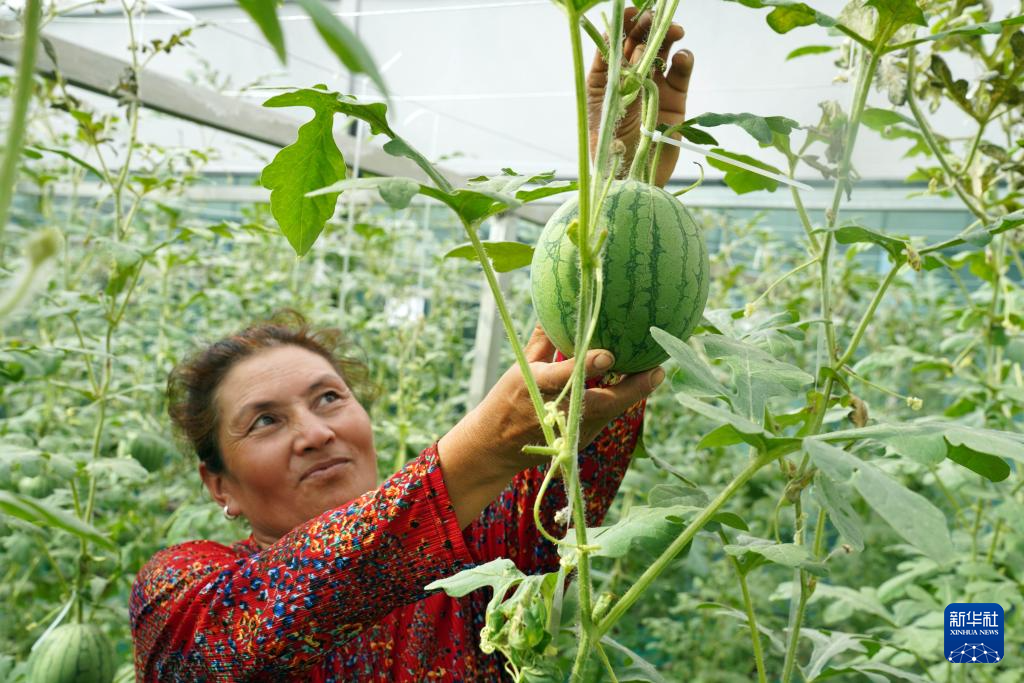 9月21日,在新疆喀什地区疏勒县郭牌西瓜种植培训基地,维吾尔族员工阿依谢姆古丽在采摘西瓜。