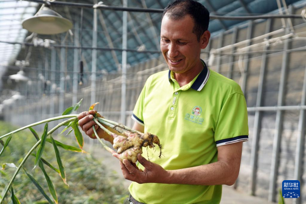 9月22日,在新疆喀什地区英吉沙县戈壁设施农业产业园,一位员工在展示收获的生姜。据了解,该产业园是山东省援疆指挥部产业援疆重点发展项目之一,一期占地面积1037亩,建设戈壁智能日光温室大棚233座,种植花卉、蔬菜等作物,年产值约5000万元,带动当地1500多名农民就业。