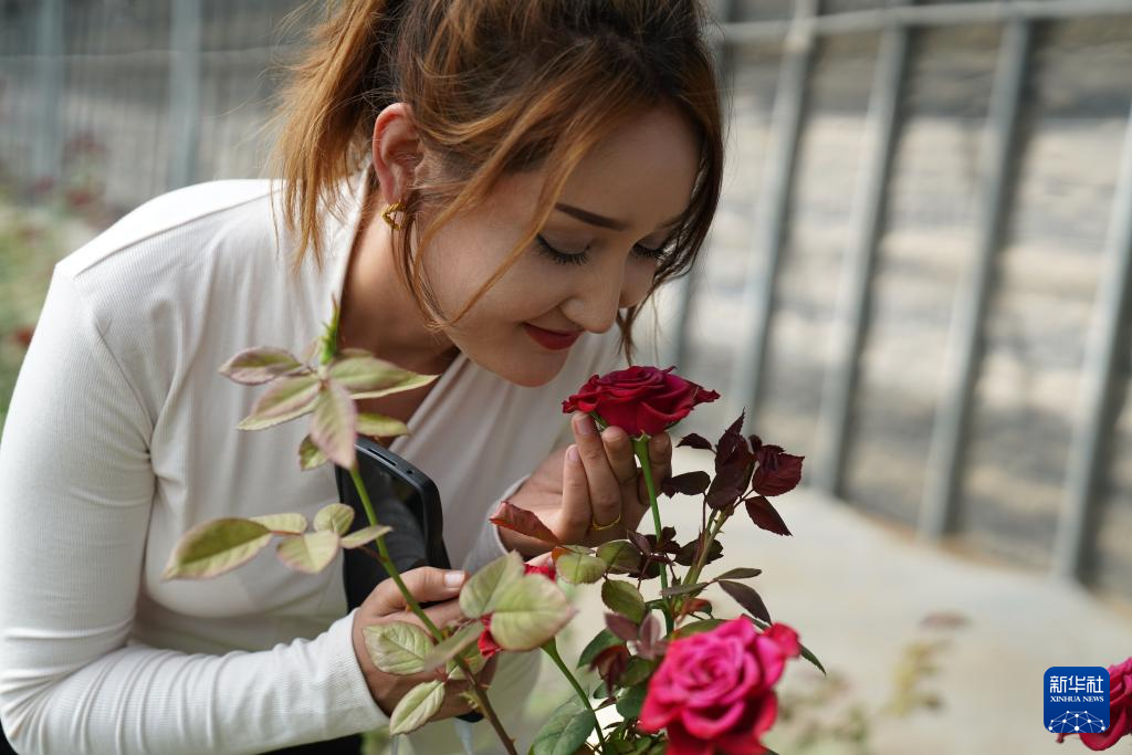 9月22日,在新疆喀什地区英吉沙县戈壁设施农业产业园,员工阿斯姆古力在闻玫瑰花香。喀什红玫瑰等鲜切花出口吉尔吉斯斯坦等中亚国家。据了解,该产业园是山东省援疆指挥部产业援疆重点发展项目之一,一期占地面积1037亩,建设戈壁智能日光温室大棚233座,种植花卉、蔬菜等作物,年产值约5000万元,带动当地1500多名农民就业。