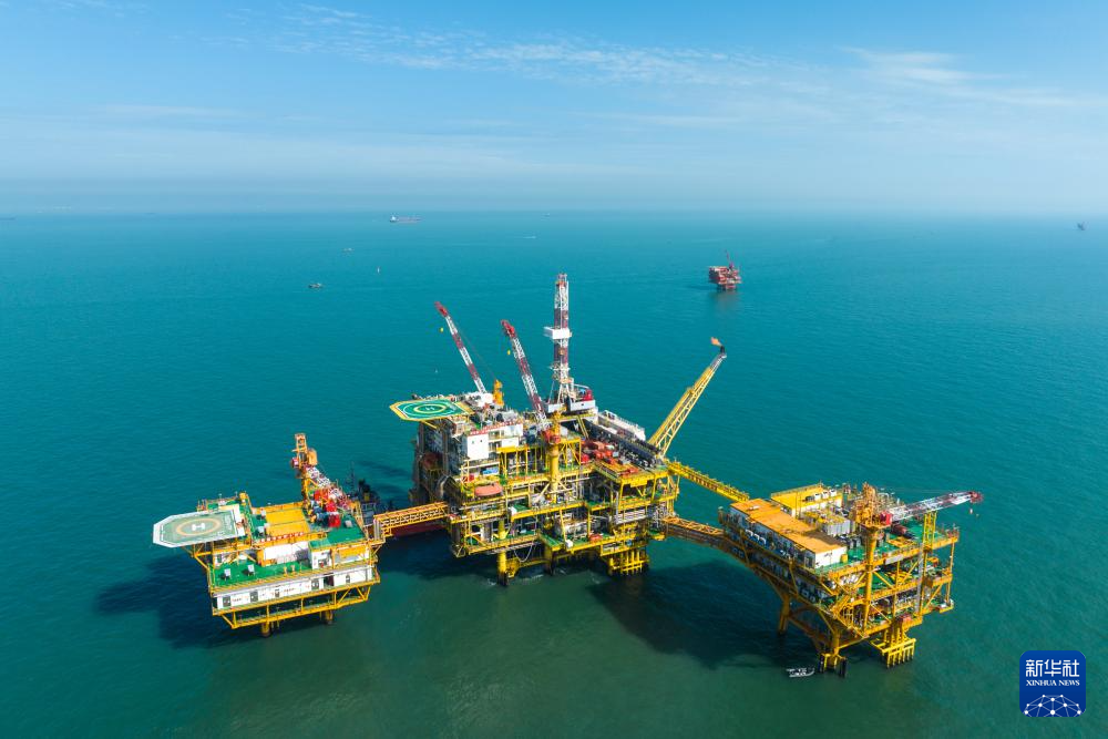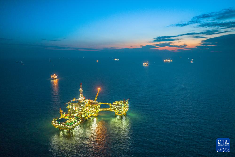 这是9月25日拍摄的连接了岸电的渤海油田海上作业平台(无人机照片)。