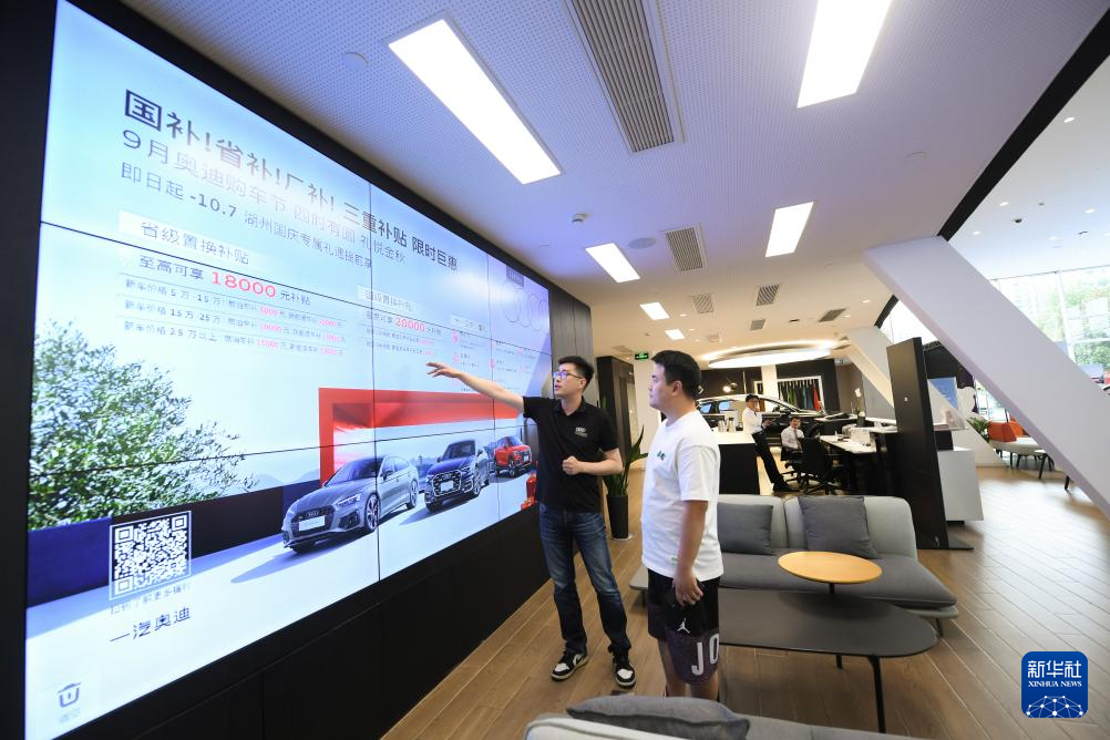 9月24日,在位于湖州市湖东街道的奥迪销售门店,工作人员向顾客介绍以旧换新补贴政策。