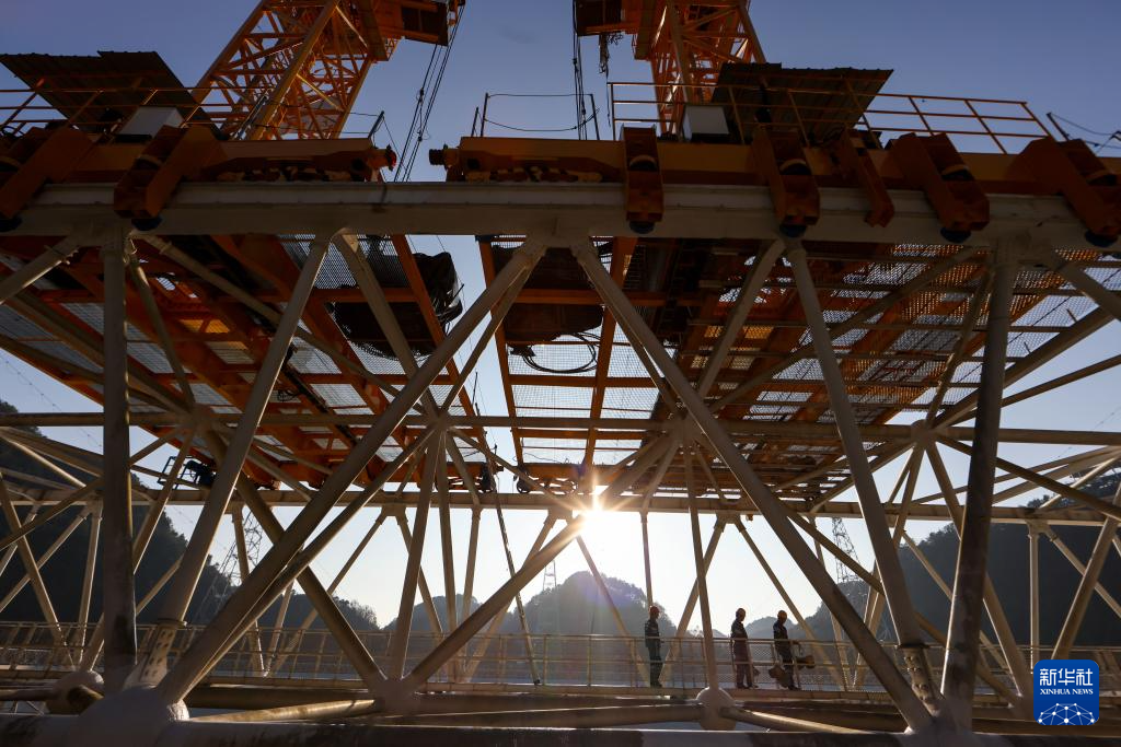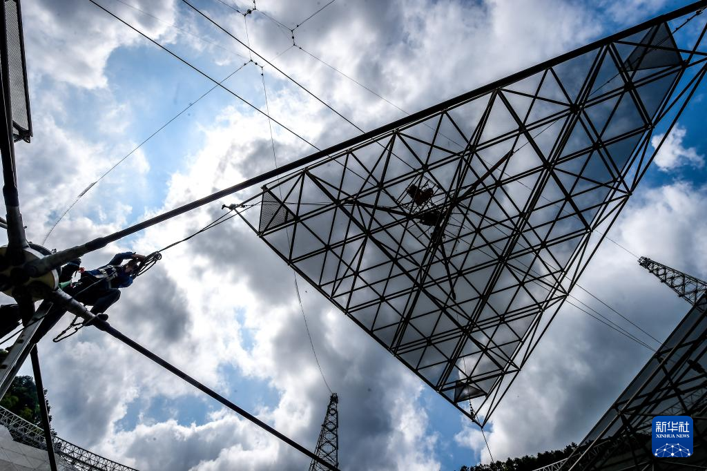 2021年12月19日,工作人员从“中国天眼”圈梁上经过。