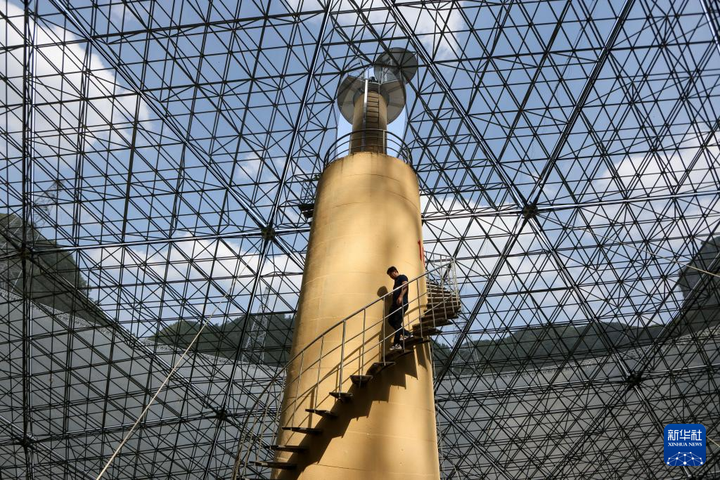 2022年8月25日,工作人员从“中国天眼”测量基墩上走下。