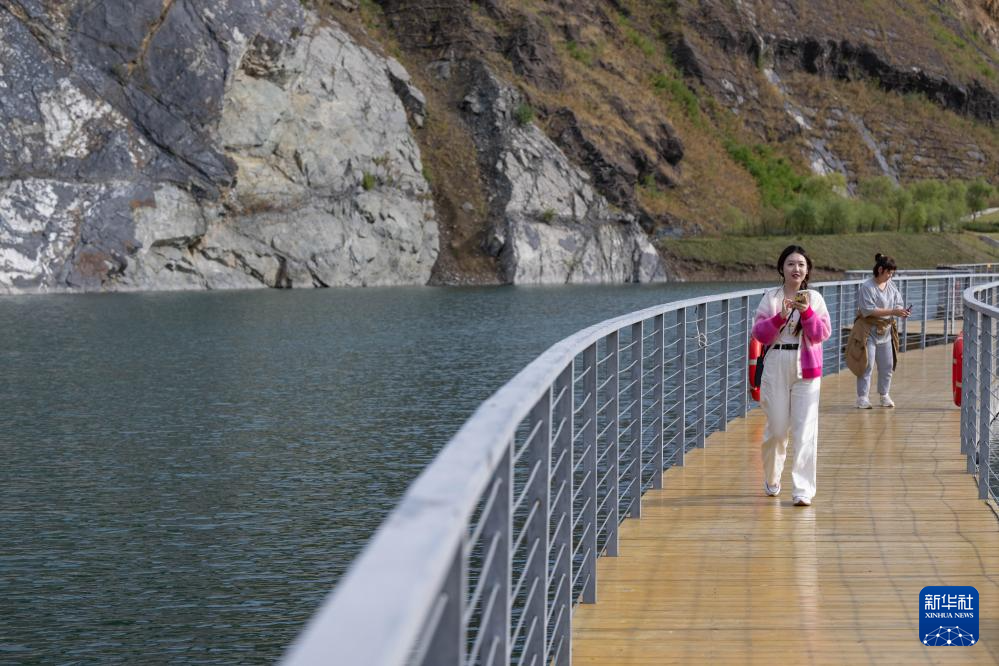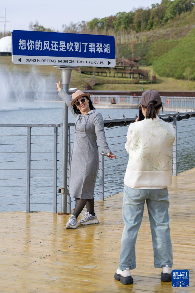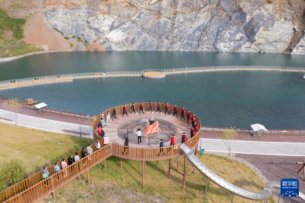 秋日时节,翡翠湖矿坑公园内碧蓝色的湖面如一颗蓝翡翠镶嵌在大地上,与周边山林的绿色、散步的游人共同构成一幅人与自然和谐共生的美丽画卷。