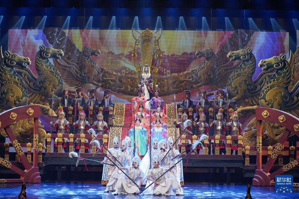 7月9日,演员在武威西凉大剧院表演大型沉浸式情景舞台剧《天马行》。