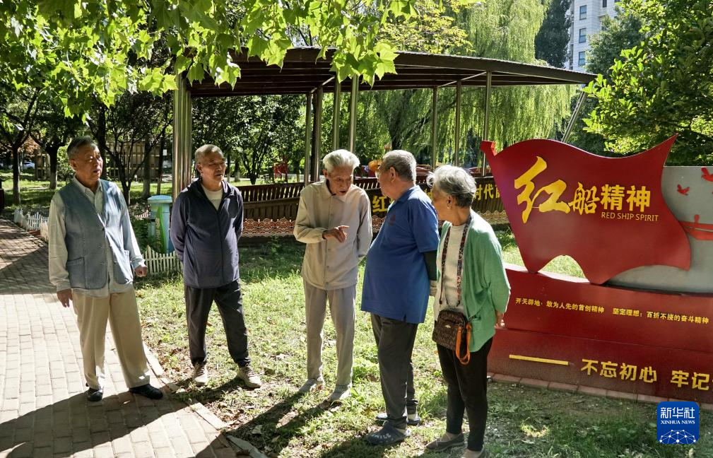 9月25日,珠江紫台社区“红船文化”宣传队的老党员在研究党建文化宣传主题。