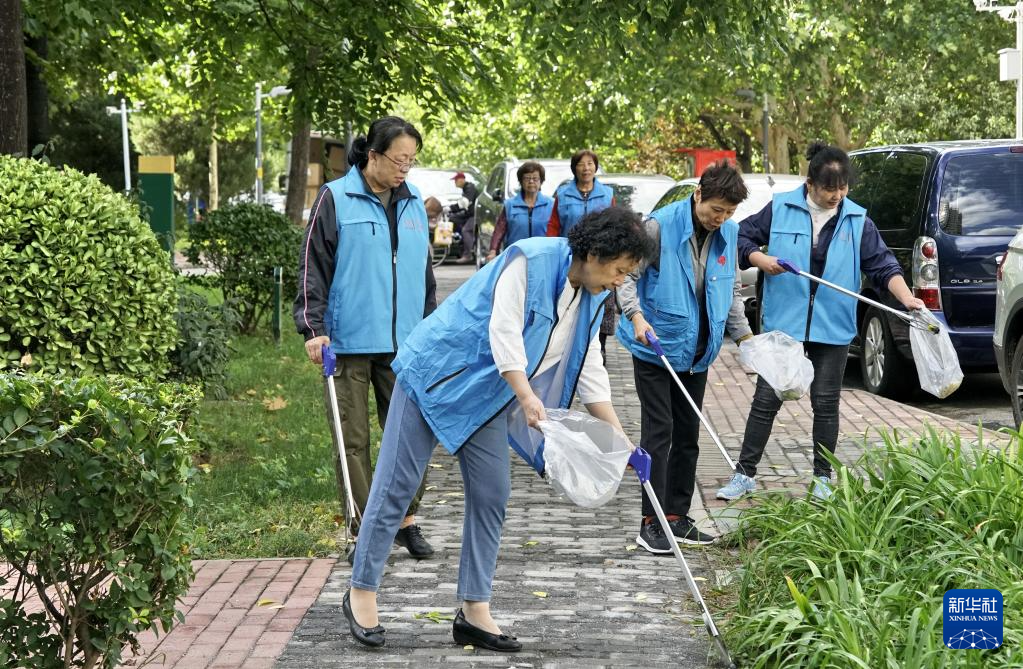 9月25日,珠江紫台社区的志愿者服务队在社区内捡拾垃圾。